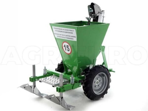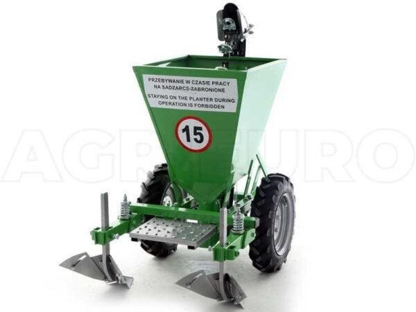 Avec la machine équipée de deux roues en caoutchouc, les pommes de terre peuvent être plantées à une distance de 32 cm l’une de l’autre.